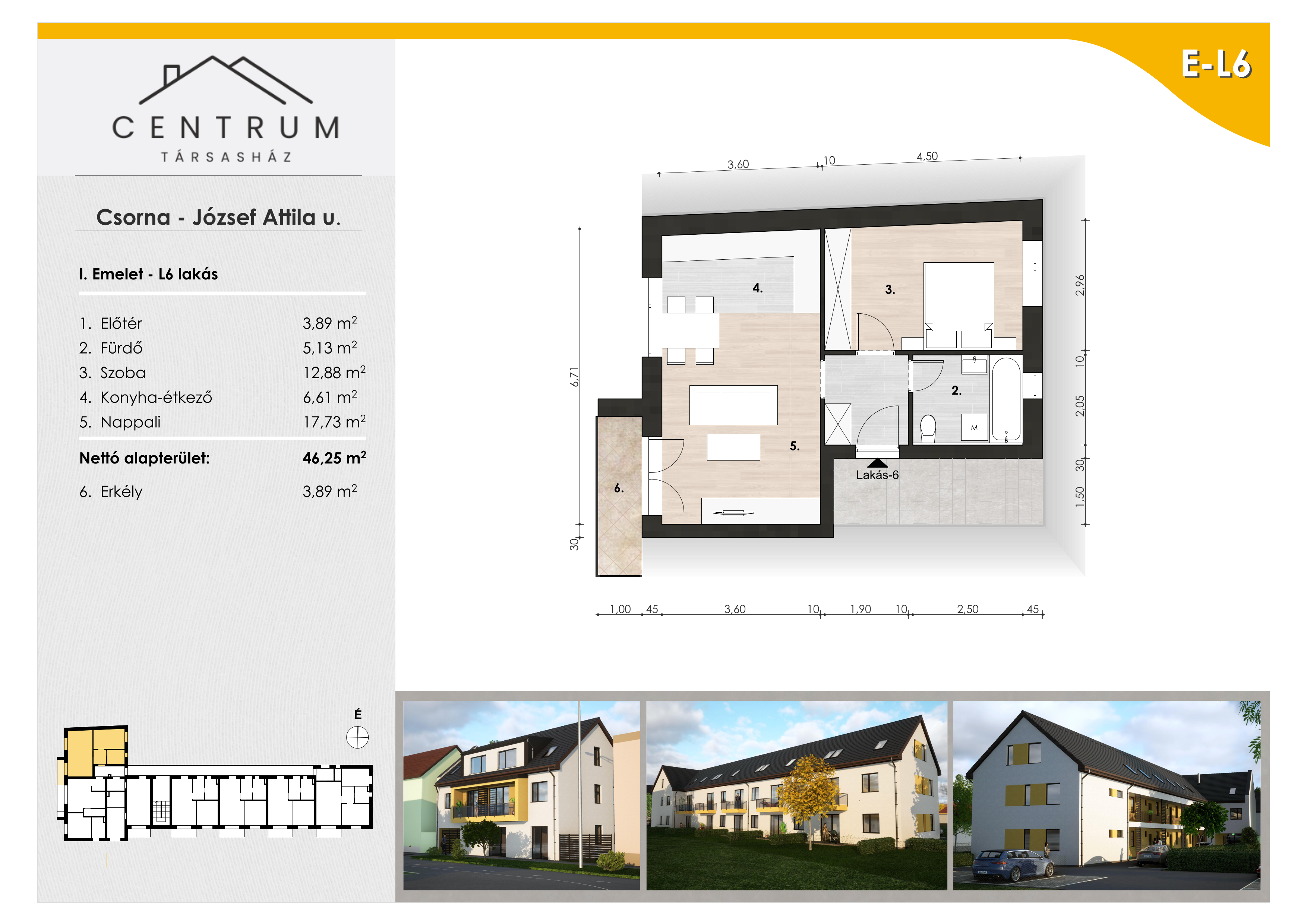 Az ingatlan alapterülete 46,26 m², amely 1 nappalival és 1 szobával rendelkezik. A lakáshoz tartozik egy 3,89 m²-es terasz. Minden lakásunkhoz jár egy udvari parkolóhely. Az ára:43.300.000.FT